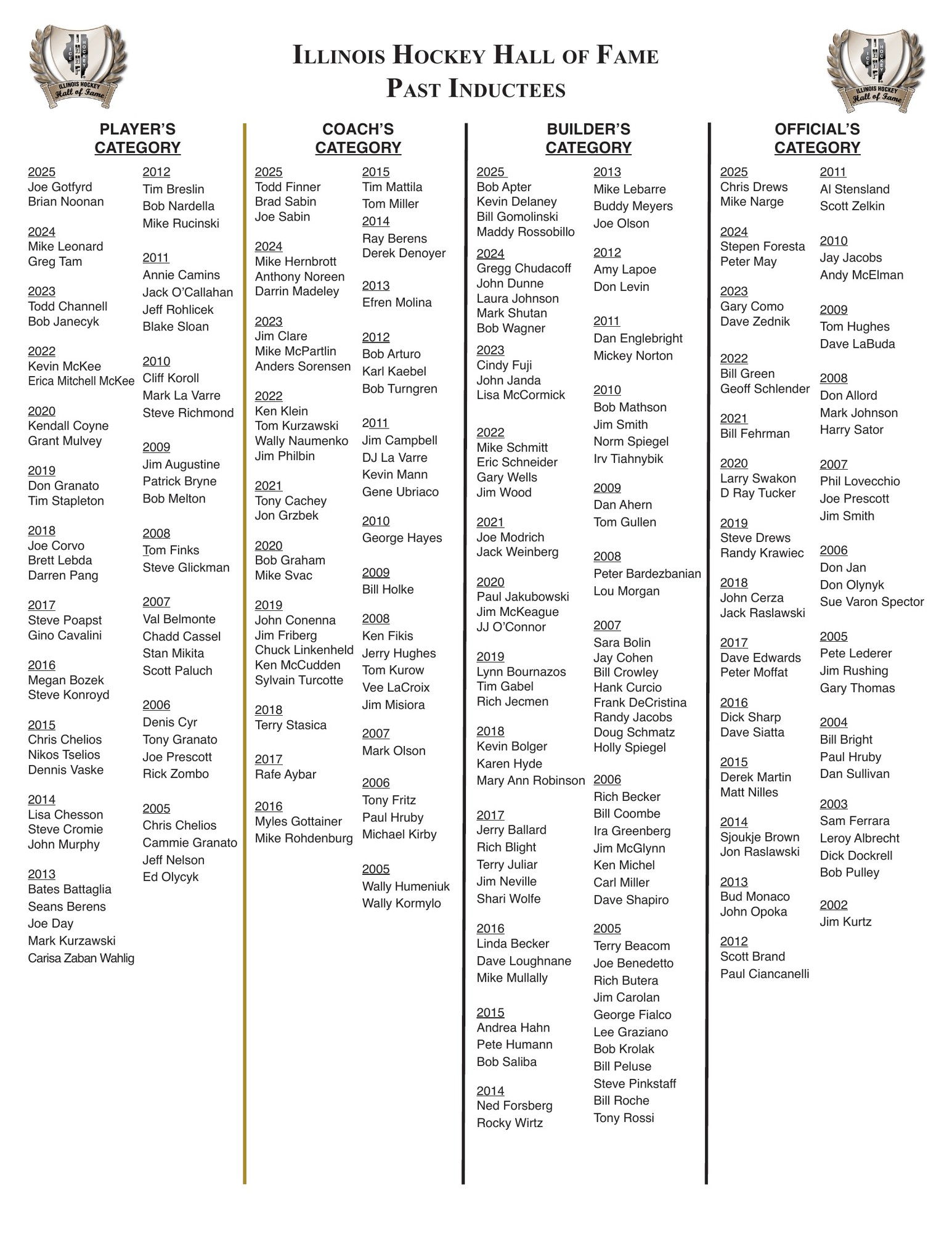 Mission Statement: To honor the excellence of those individuals who, through their exceptional endeavors both on and off the ice, have contributed in an extraordinary way to enhance the sport and image of hockey in Illinois.